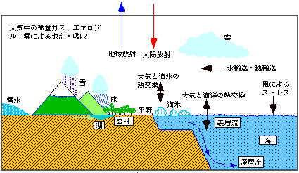 気候とは「大気と海洋から成る熱機関である」とするならば、気候という熱機関を「大気」の部分と「海洋」の部分に分けて考えるのがひとつのやり方だ。実際、気候システム研究センターで用いられている方法もこれである。大気という熱機関の動力学の研究は「天気予報」という名前でわれわれにはお馴染みである。その目的とするところは、「太陽からの熱+海洋表面の温度」を与えた時に大気がどのように運動し、どのように温度が変化するかという事を知る事である。つまり、海洋という熱源と太陽という熱源、2つの熱源と熱のやり取りをしている熱機関として「大気」を扱うのが天気予報と言うわけだ。